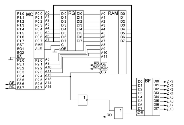 Подключить к МК внешнее ОЗУ на 4 кБ и буфер на 8 ДК. Дать пример контроля линии ДК1.