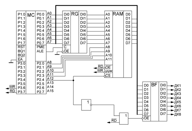 Подключить к МК внешнее ОЗУ на 4 кБ и буфер на 8 ДК. Дать пример контроля линии ДК1.