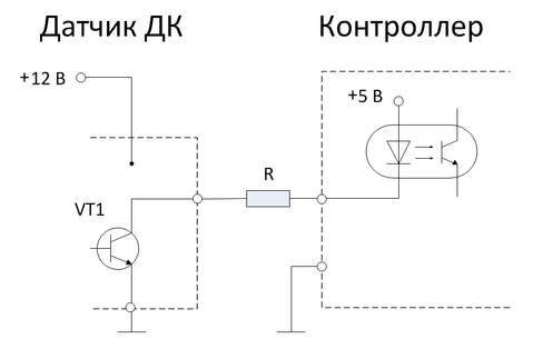 1. Подключить активный датчик с выходом «Открытый коллектор n-p-n» и питанием 12 В к контроллеру со входом «Открытый катод СД». Рассчитать балластный резистор светодиода, если анод подключен к 5 В номинальный ток светодиода – 12 мА.