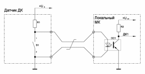 1. Подключить датчик ДК с выходом «Сухой контакт» к контроллеру с входом «Открытый катод СД». Обеспечить ток через светодиод и на линии связи 10 мА, питание анода светодиода – 5 В.