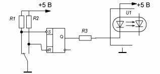 Подключить датчик ДК с выходом «Сухой контакт» к контроллеру с входом «Открытый катод СД». Обеспечить ток через светодиод и на линии связи 8 мА, питание анода светодиода – 5 В. Обеспечить аппаратное подавление дребезга контактов.