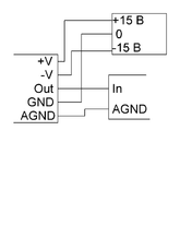 Обеспечить подключение датчика температуры с диапазоном -50..+100°С, потенциальным выходом ±10 В и питанием ±15 В к входу АК контроллера ±10 В. Выводы датчика +V, -V, GND, Out, AGND. Рассчитать и построить характеристику Т(U). Сколько градусов приходится на дискрету, если преобразование 16-и разрядное.