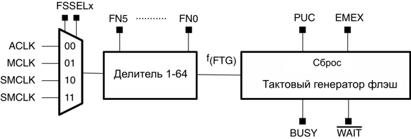 Тактовый генератор флэш-памяти может тактироваться от ACLK, SMCLK или MCLK. Тактовый сигнал выбранного источника должен быть поделен с помощью битов FNx для обеспечения необходимых требований к частоте f(FTG). Если появляется девиация (отклонение) частоты f(FTG) от требуемого значения в ходе записи или стирания, результат записи или стирания может быть непредсказуемым или же флэш-память окажется подвергнутой ударной перегрузке сверх допустимых пределов, гарантирующих надежную работу.