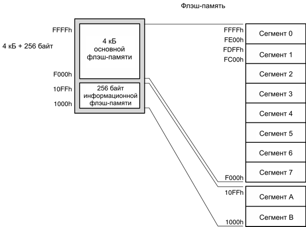Флэш-память в MSP430 разбита на сегменты. В неё может быть записан один бит, байт или слово, но сегмент – это минимальный размер флэш-памяти, который можно стереть. Три режима стирания позволяют стереть один сегмент, стереть все главные сегменты или стереть все сегменты (основные и информационные сегменты).