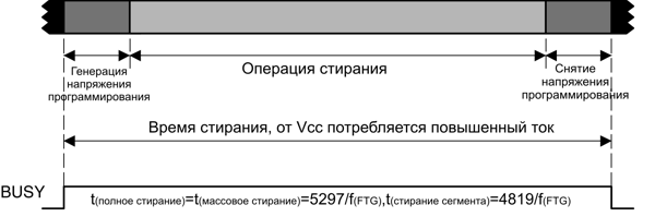 Любой цикл стирания может быть инициирован программой, находящейся как во флэш-памяти, так и в ОЗУ. Когда стирание сегмента инициировано программой из флэш-памяти, все тактирование выполняется контроллером флэш-памяти, а ЦПУ останавливается до завершения цикла стирания. После окончания цикла стирания ЦПУ продолжает выполнение программного кода с команды, следующей за фиктивной записью.