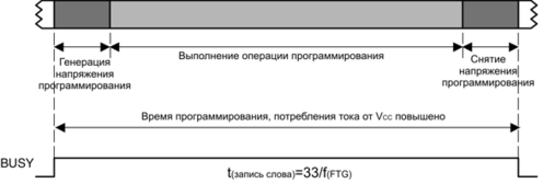 Операция записи байта/слова может инициироваться программой из флэш-памяти или из ОЗУ. Когда инициирование происходит из флэш-памяти, все тактирование осуществляется контроллером флэш-памяти, а ЦПУ ожидает завершения записи. После выполнения записи ЦПУ продолжает выполнение кода с команды, следующей за командой записи. Временная диаграмма процедуры записи байта/слова показана на рис. 5.7.