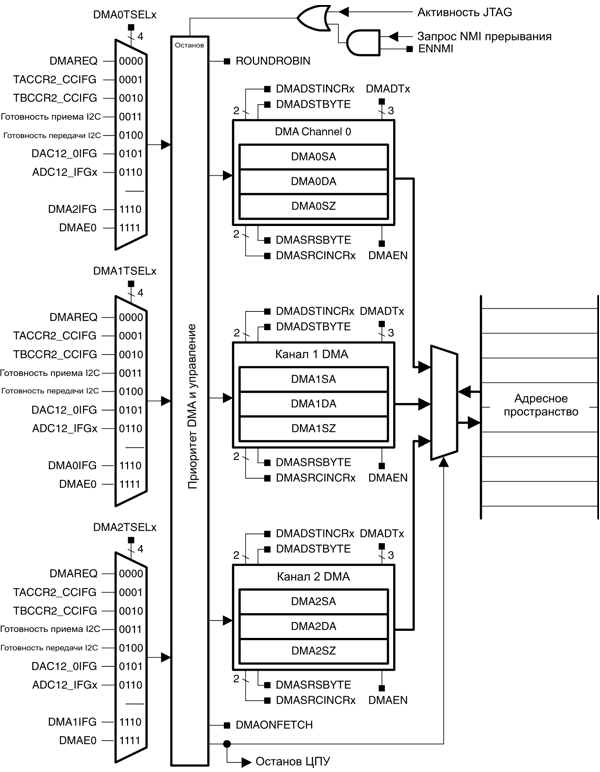 Модуль контроллера DMA переносит данные из одного адреса в другой без участия ЦПУ. Этот раздел описывает работу контроллера DMA. Контроллер DMA реализован в устройствах MSP430x15x и MSP430x16x.