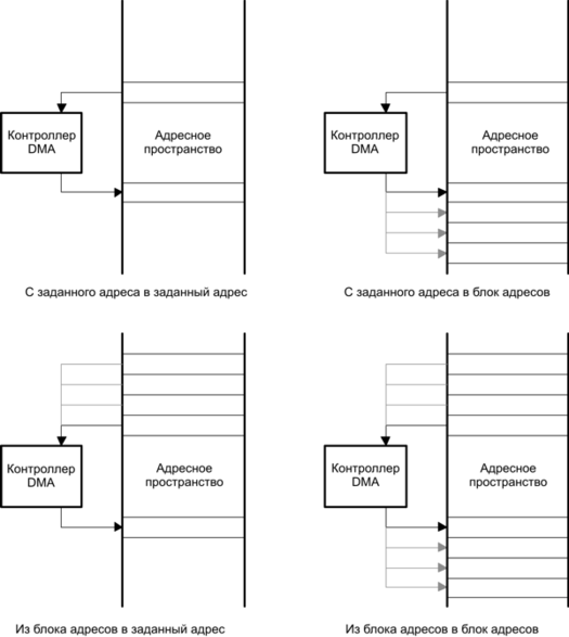 Контроллер DMA имеет четыре режима адресации переноса, показанные на рис.8.2: