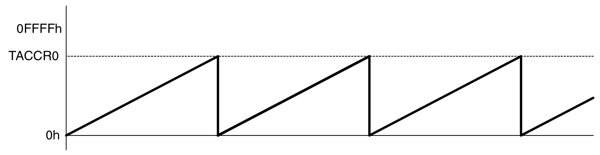 Режим «вверх» используется, если период таймера должен отличаться от количества отсчетов 0FFFFh. Таймер многократно считает вверх до значения, содержащегося в регистре сравнения TACCR0, который задает период, как показано на рис.11-2. Количество отсчетов таймера в периоде равно TACCR0+1. Когда значение таймера становится равно содержимому TACCR0, таймер перезапускается, начиная счет от нуля. Если режим «вверх» выбран, когда значение таймера больше содержимого TACCR0, таймер немедленно перезапускается, начиная считать от нуля.