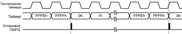 Флаг прерывания TAIFG устанавливается, когда таймер считает от 0FFFFh к нулю. На рис.11-5 показан цикл установки флага.