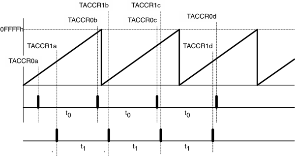 Временные интервалы можно реализовать также в других режимах, где TACCR0 используется как регистр периода. Их обработка более комплексна, поскольку сумма старого значения TACCRx и нового периода может быть выше значения TACCR0. Когда предыдущее значение TACCRx плюс tx больше величины TACCR0, значение TACCR0 должно быть вычтено для получения правильного временного интервала.
