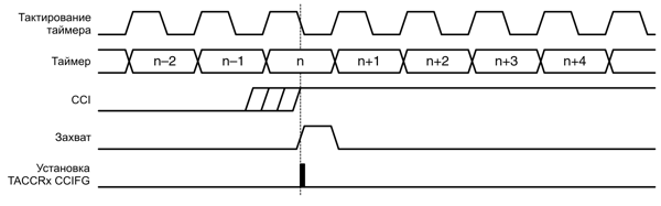 Режим захвата выбирается, когда CAP=1. Режим захвата используется для регистрации временных событий. Это может потребоваться для быстрых вычислений или для измерения времени. Входы захвата CCIxA и CCIxB подключаются к внешним выводам или к внутренним сигналам и выбираются с помощью битов CCISx. Биты CMx определяют, как будет происходит захват: по фронту входного сигнала, по его спаду или в обоих случаях. Захват происходит по выбранному фронту входного сигнала. Если захват произошел, тогда: