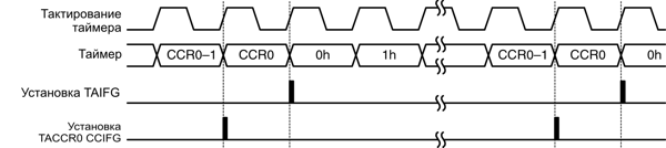 Флаг прерывания TACCR0 CCIFG устанавливается, когда значение таймера равно содержимому TACCR0. Флаг прерывания TAIFG устанавливается, когда таймер считает от TACCR0 к нулю. На рис.11-3 показан цикл установки флагов.