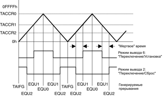 Режим «вверх/вниз» поддерживает приложения, требующие наличия «мертвого» времени между выходными сигналами (см. раздел «Модуль вывода Таймера А»). К примеру, чтобы избежать перегрузки, два выхода, управляющие H-мостом никогда не должны одновременно иметь высокий уровень. В примере, показанном на рис.11-9 величина времени простоя tdead составляет: