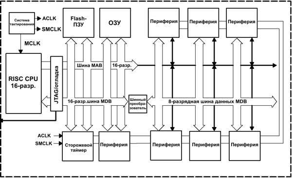 Микроконтроллеры семейства MSP430 содержат 16-разрядное RISC CPU, периферийные модули и гибкую систему тактирования, соединенные через фон-Неймановскую общую адресную шину (MAB) памяти и шину памяти данных (MDB). Объединяя современное CPU с отображаемыми в памяти аналоговыми и цифровыми периферийными устройствами, семейство MSP430 предлагает решения для приложений со смешанными сигналами.
