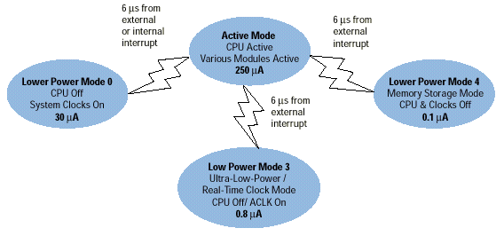 Для эффективного использования энергии батареи семейство микроконтроллеров MSP430 использует пять режимов энергосбережения: LPM0, LPM1, LPM2, LPM3 и LMP4. На рисунке 2 показаны три основных режима энергосбережения LPM из пяти(Low Power Mode).