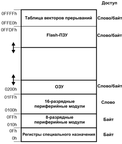 Периферийные модули отображены в адресном пространстве. Адреса с 0100 до 01FFh зарезервированы для 16-разрядных периферийных модулей. Они будут доступны с помощью команд-слов. Если используются однобайтные команды, допустимы только четные адреса, при этом старший байт результата всегда будет содержать «0».