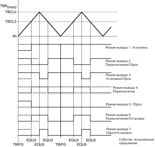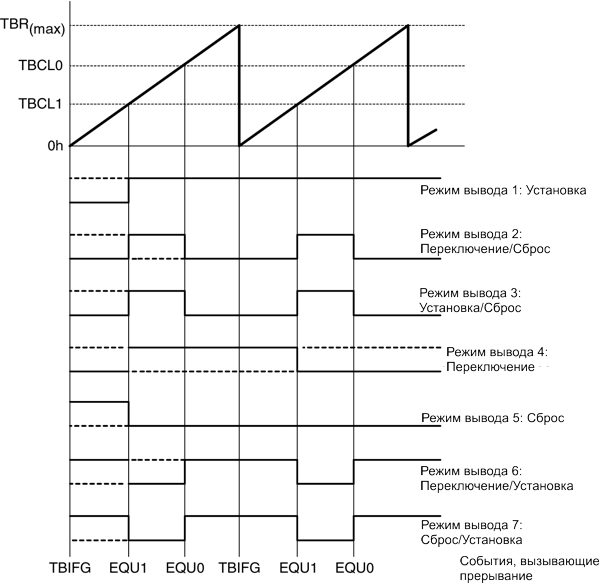 | 011 | Установка/сброс | Выход устанавливается, когда таймер досчитывает до значения TBCLx. Он сбрасывается, когда таймер досчитывает до значения TBCL0. |