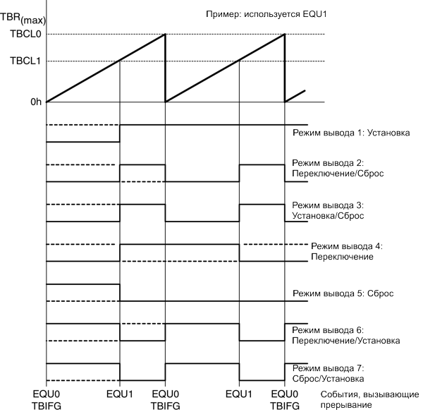 Сигнал OUTx изменяется, когда таймер достигает значений TBCLx и TBCL0, в зависимости от режима вывода. Пример с использованием TBCL0 и TBCL1 показан на рис.12-13.