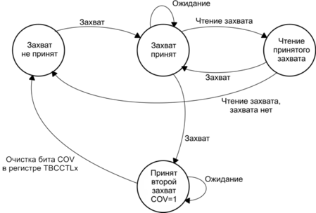 Захваты могут быть инициированы программно. Биты CMx могут устанавливаться для выполнения захвата на обоих фронтах. В этом случае программное обеспечение устанавливает бит CСIS1=1 и переключает бит CCIS0 для переключения сигнала захвата между VCC и GND, инициируя захват каждый раз, когда CCISO изменяет состояние: