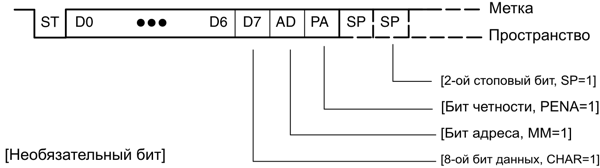 7- или 8-разрядные данные с проверкой четности/нечетности и без контроля четности