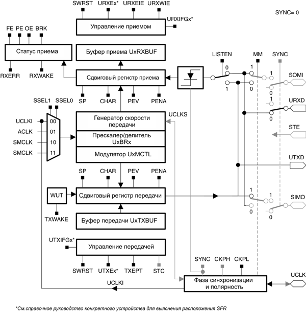 В асинхронном режиме USART подключает MSP430 к внешней системе через два внешних вывода: URXD и UTXD. Режим UART выбирается при очистке бита SYNC.