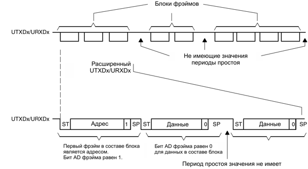 Новый символ, представляющий заданный адрес, сдвигается наружу после периода простоя, идентифицировавшего адрес на UTXDx. Необходима запись первого незначащего символа в UxTXBUF для сдвига бита TXWAKE в WUT и генерации состояния свободной линии. Эти данные отбрасываются и не появляются на UTXDx.