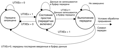 Рекомендуется отключать передатчик (UTXEx=0) только после завершения любой выполнявшейся передачи. На это указывает установка бита опустошения передатчика (TXEPT=1). Любые данные, записанные в UxTXBUF в тот момент, когда передатчик отключен, будут находится в буфере, но не будут помещены в сдвиговый регистр передачи или переданы. Однократная установка UTXEx вызовет немедленную загрузку в сдвиговый регистр передачи данных из буфера передачи и возобновит передачу символа.