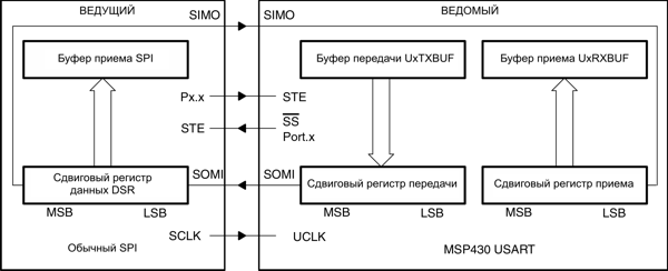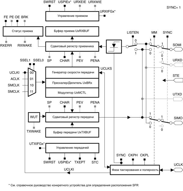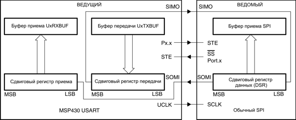В синхронном режиме последовательные данные передаются и принимаются множеством устройств с использованием общего тактирования, обеспечиваемого ведущим. Дополнительный вывод STE, управляемый ведущим, необходим для разрешения приема и передачи данных устройством.