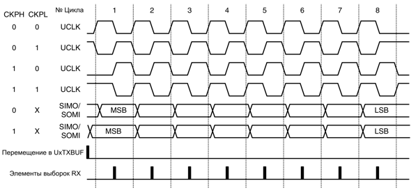 Полярность и фаза UCLK раздельно конфигурируются через управляющие биты CKPL и CKPH модуля USART. Синхронизация для каждого случая показана на рис.14-9.