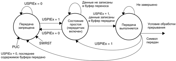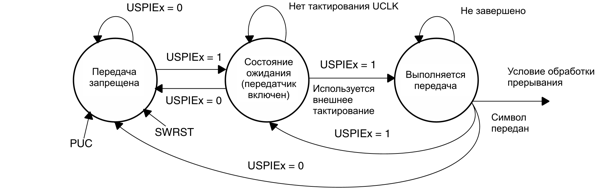 Бит включения USPIEx передачи/приема SPI включает или отключает USART в режиме SPI. Когда USPIEx=0, USART останавливает работу после завершения текущей передачи или немедленно, если действий не выполнялось. Сигнал PUC или установка бита SWRST отключают USART немедленно, при этом любая выполняющаяся передача прерывается.