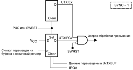 Флаг прерывания UTXIFGx устанавливается передатчиком для указания, что UxTXBUF готов к приему другого символа. Запрос прерывания генерируется, если также установлены флаги UTXIEx и GIE. UTXIFGx автоматически сбрасывается, если запрос прерывания обработан или если символ записан в UxTXBUF.