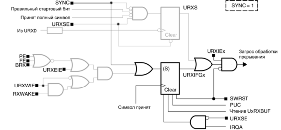 Флаг прерывания URXIFGx устанавливается каждый раз, когда символ принят и загружен в UxRXBUF, как показано на рис.14-11 и 14-12. Запрос прерывания генерируется, если также установлены флаги URXIEx и GIE. URXIFGx и URXIEx сбрасываются сигналом системного сброса PUC или когда SWRST=1. URXIFGx сбрасывается автоматически, если ожидаемое прерывание обработано или когда UxRXBUF прочитан. Это показано на рис.14-11 и рис.14-12.