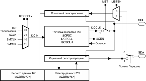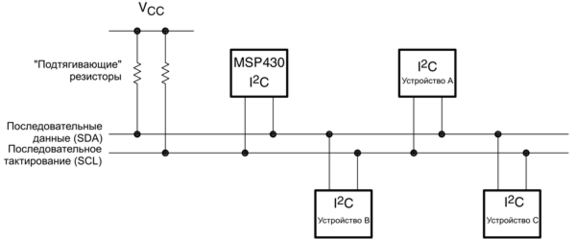 Модуль управления взаимообменом между интегральными схемами (I2C) обеспечивает интерфейс между MSP430 и I2C-совместимыми устройствами через последовательную двухпроводную шину I2C. Внешние компоненты, подключенные к шине I2C последовательно передают и принимают последовательные данные в/из USART через 2-х проводной I2C-интерфейс.