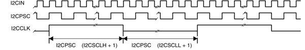 Модуль I2C работает с источником тактовой частоты, выбираемым битами I2CSSELx. Прескалер I2CPSC и регистры I2CSCLH и I2CSCLL определяют частоту и скважность тактового сигнала SCL для режима ведомого, как показано на рис.15-14. Источник тактовых импульсов для модуля I2C должен иметь частоту, по крайней мере в 10 раз больше частоты SCL в обоих режимах ведущего и ведомого.