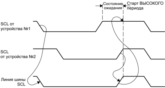 Медленный ведомый может установить на SCL низкий уровень, чтобы замедлить быстрого ведомого. Когда это происходит, все другие устройства должны войти в состояние ожидания. Это позволяет медленному ведомому замедлять быстрого ведущего.