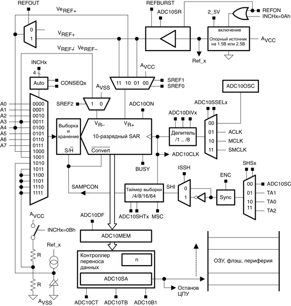 Модуль АЦП10 обеспечивает быстрые 10-разрядные аналого-цифровые преобразования. Модуль имеет 10-разрядное ядро с регистром последовательного приближения SAR, схему выборки, опорный генератор и контроллер переноса данных (DTC).