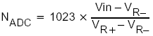 Ядро АЦП преобразует аналоговый входной сигнал в 10-разрядное цифровое представление и сохраняет результат в регистре ADC10MEM. Ядро использует два программно выбираемых уровня напряжений (VR+ и VR-) для задания верхнего и нижнего пределов преобразования. Цифровой выход (NADC) составляет полную шкалу (03FFh), когда входной сигнал равен или выше VR+, и равен нулю, когда входной сигнал равен или ниже VR-. Входной канал и опорные уровни напряжений (VR+ и VR-) задаются в памяти управления преобразованиями. Результаты преобразования могут быть представлены в натуральном двоичном формате или формате с дополнением до двух. Формула преобразования для результата АЦП NADC с использованием натурального двоичного формата выглядит следующим образом: