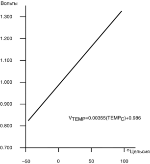 Типичная передаточная функция температурного датчика показана на рис.17-10. Если используется температурный датчик, период выборки должен быть больше 30 мкС. Ошибка смещения температурного датчика может быть большой и может потребоваться калибровка для большинства приложений. См. справочные данные конкретного устройства для выяснения подробностей.