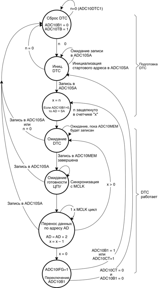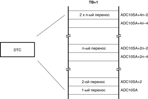 Внутренний указатель адреса первоначально равен ADC10SA, а внутренний счетчик переносов первоначально равен «n». Внутренний указатель и счетчик являются невидимыми для программного обеспечения. DTC переносит значение слова ADC10MEM по адресу, находящемуся в адресном указателе ADC10SA. После каждого DTC-переноса внутренний адресный указатель инкрементируется на два, а внутренний счетчик переносов декрементируется на один.
