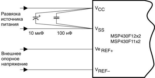 При выборе температурного датчика автоматически запускается расположенный на кристалле опорный генератор в качестве источника напряжения для температурного датчика. Однако это не включает выход VREF+ и не влияет на выбор опорного источника для преобразования. Процедура выбора источника для преобразования информации с температурного датчика подобна процедуре выбора любого другого канала.