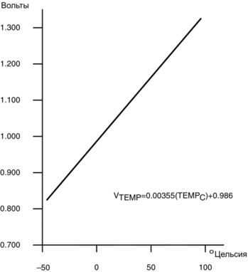 Типичная передаточная функция температурного датчика показана на рис.18-13. При использовании температурного датчика, период выборки должен быть больше 30 мкС. Ошибка смещения температурного датчика может быть большой и для большинства приложений может потребоваться калибровка. См. справочные данные конкретного устройства для выяснения подробностей.