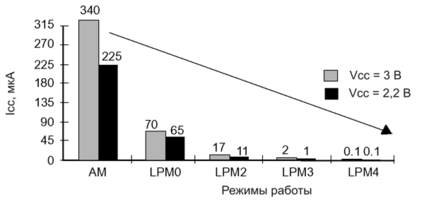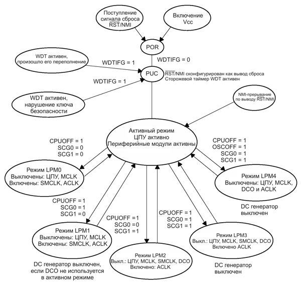 Семейство MSP430 разработано для приложений с ультранизким потреблением мощности и имеет различные режимы работы, показанные на рис.2.10.