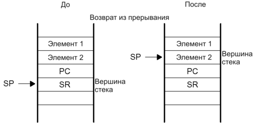 Исходное содержимое регистра SR восстанавливается из стека, что приводит к возобновлению работы устройства в предыдущем режиме;