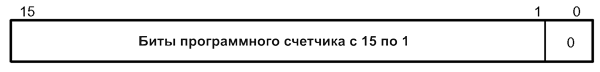 16-разрядный программный счетчик (PC/R0) указывает на следующую команду, которая будет выполняться. Каждая команда состоит из четного числа байтов (два, четыре или шесть), поэтому PC инкрементируется соответственно. Команды доступа в адресном пространстве 64 кБайт выполняются к границам слов, поэтому PC выравнивается к четным адресам. На рис.3.2 показана организация программного счетчика.
