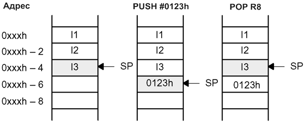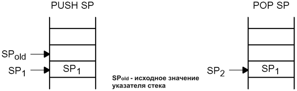 | Указатель стека изменяется после выполнения команды PUSH SP. | Указатель стека не изменяется после команды POP SP. Команда POP SP помещает SP1 в указатель стека SP (SP2=SP1). |