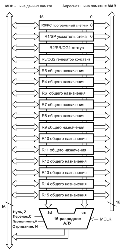 ЦПУ включает шестнадцать 16-разрядных регистров. Регистры R0, R1, R2 и R3 имеют специальное назначение. Регистры с R4 по R15 являются рабочими регистрами общего назначения.