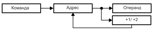 | 11 / - | Косвенный автоинкремент | @Rn+ | Содержимое Rn использовано как указатель на операнд. Содержимое Rn впоследствии увеличивается на 1 для байтовых команд и на 2 для команд-слов. |