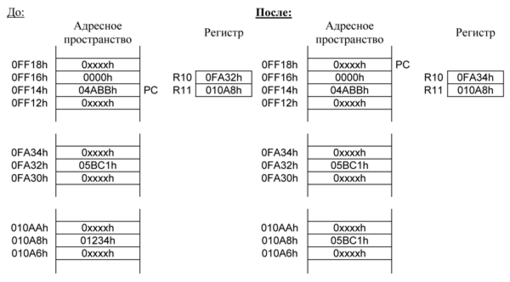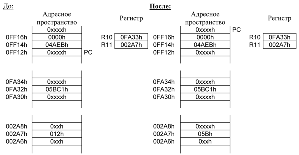 | Операция: | Пересылка содержимого с исходного адреса (содержится в R10) по адресу назначения (содержится в R11). Регистры не изменяются. |