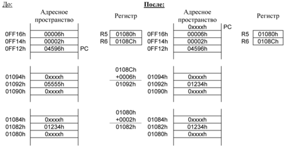 | Операция: | Пересылка содержимого с исходного адреса (равного сумме содержимого R5 + 2) по адресу назначения (содержимое R6 + 6). Регистры источника и получателя (R5 и R6) не изменяются. В индексном режиме программный счетчик автоматически инкрементируется таким образом, что выполнение программы продолжается со следующей команды. |